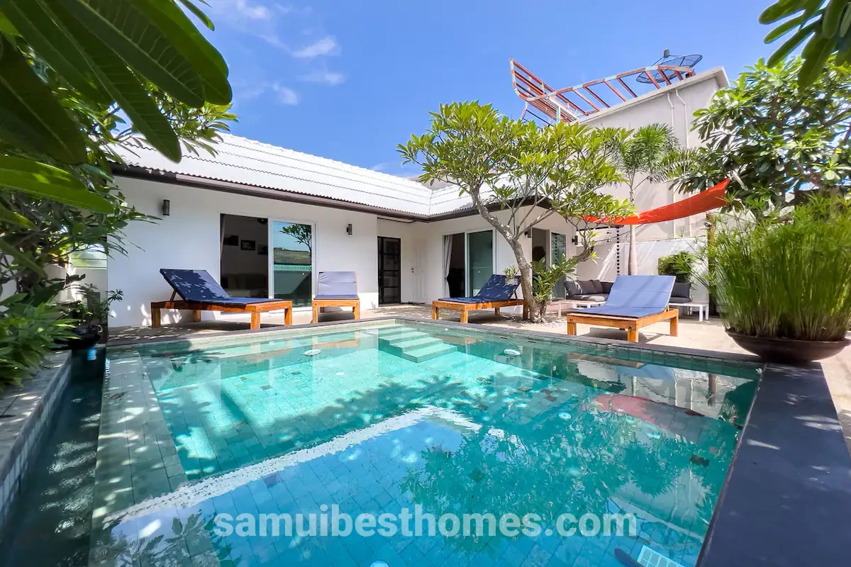 Stay in a great location on Koh Samui island when you choose this beautiful and modern holiday pool villa. Located just behind a very popular expat minimart, with imported and homemade foods abound, the Bangrak district is teeming with all of the finer things in island living.