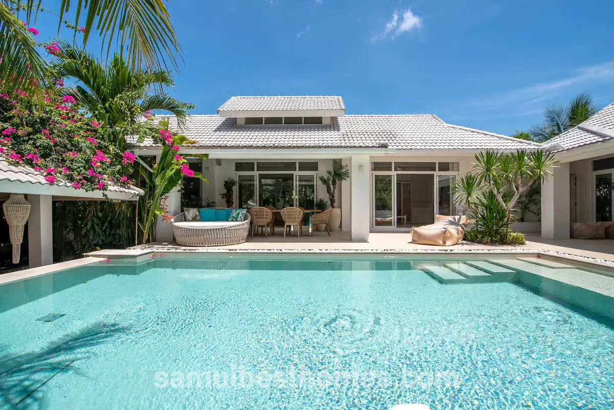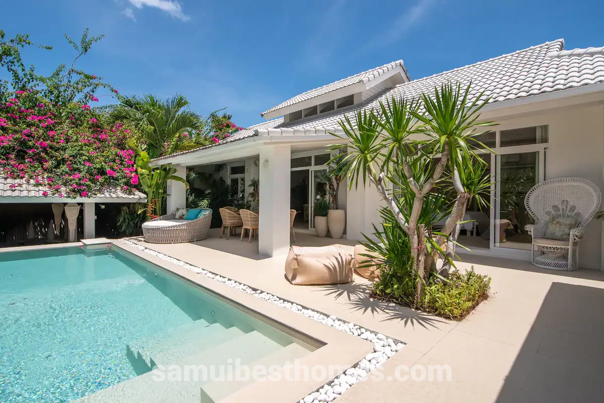 Step into modern luxury when you book this exclusive, 3-bedroom, 3.5-bathroom pool villa in the heart of Bophut, Koh Samui. Just a 3-minute drive from the island’s famous Fisherman’s Village, the home’s location is perfect for families and those who enjoy anchoring themselves in the vibrant social scene.