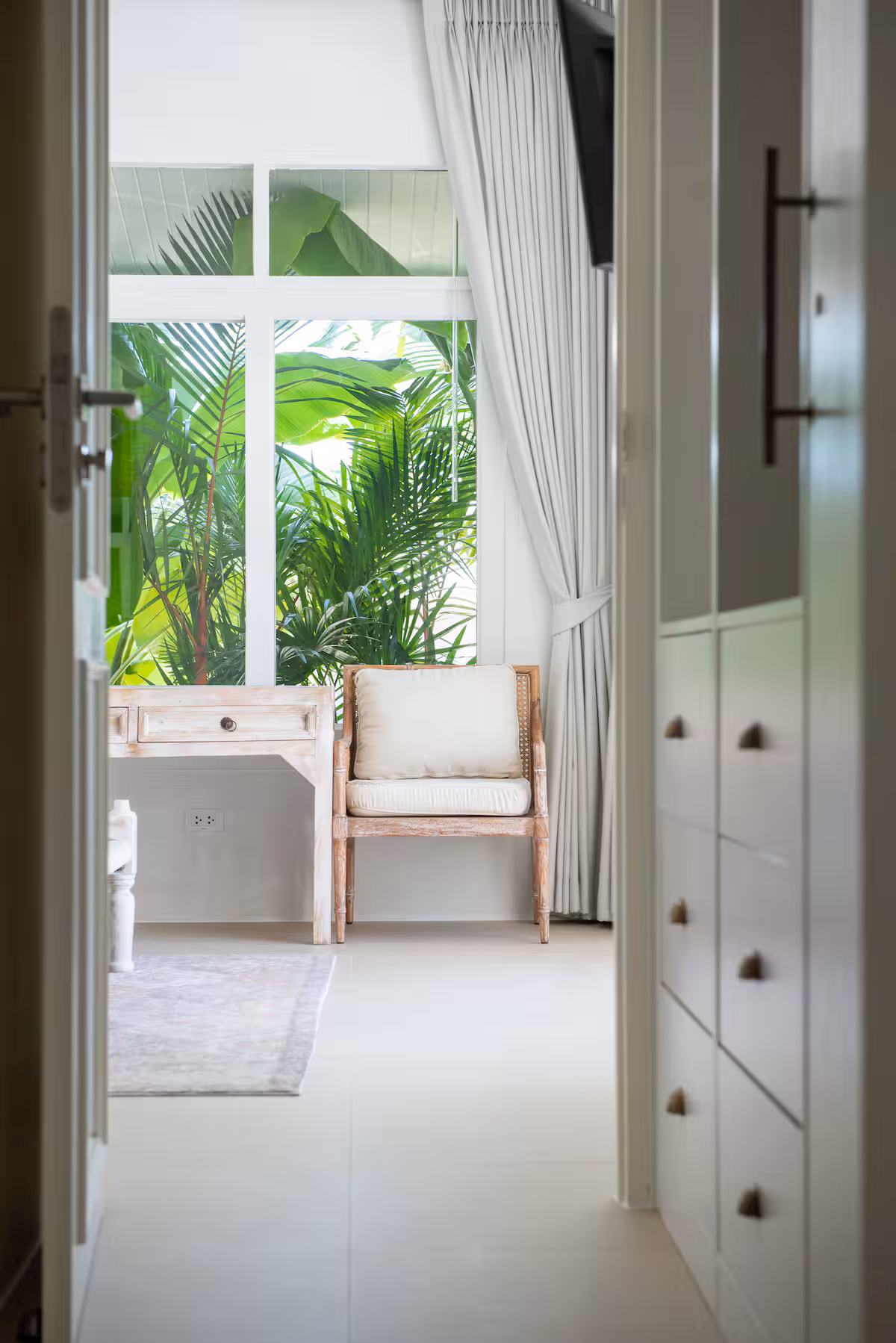 An upscale design exotically blends a natural color palette with Moroccan carvings and Bohemian decor. The linen, rattan and bamboo textiles fuse to offer an eclectic extension of the exterior surroundings to the comfort of the indoors.