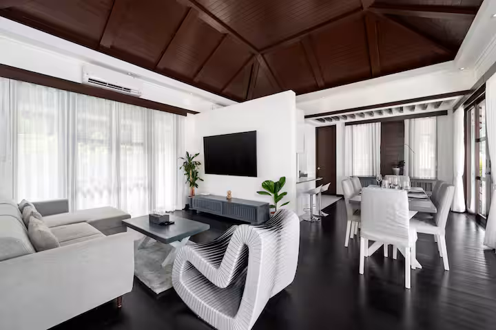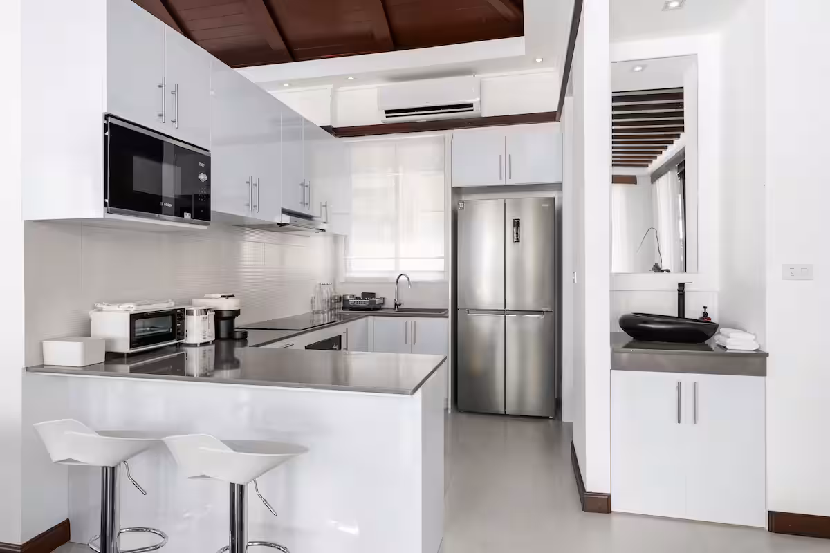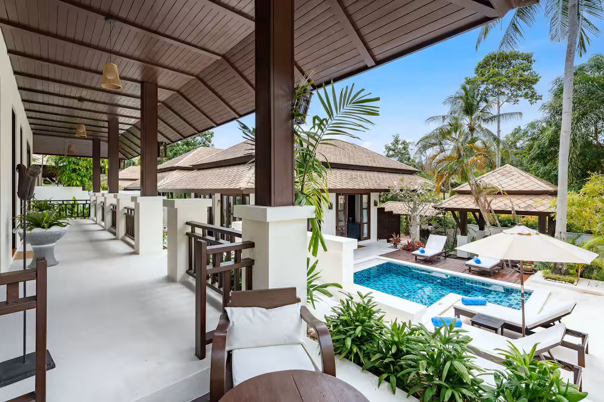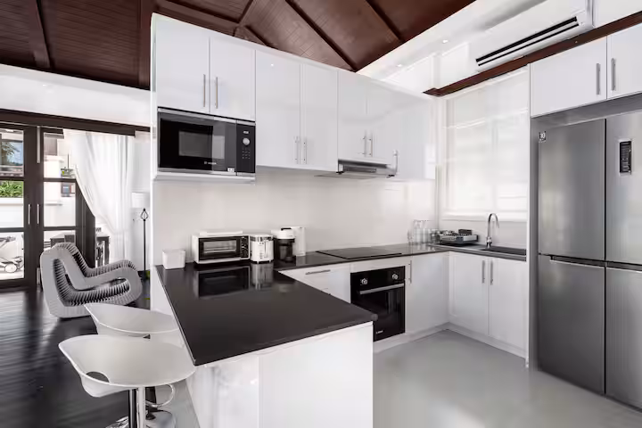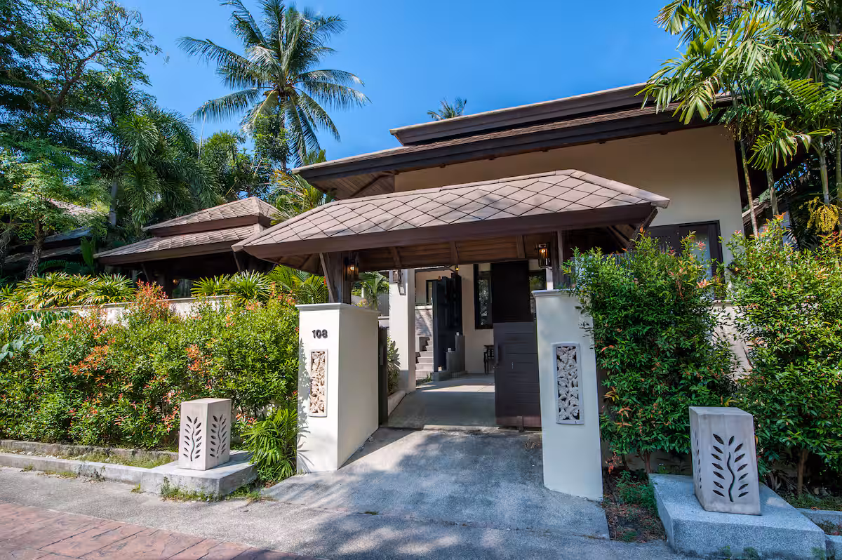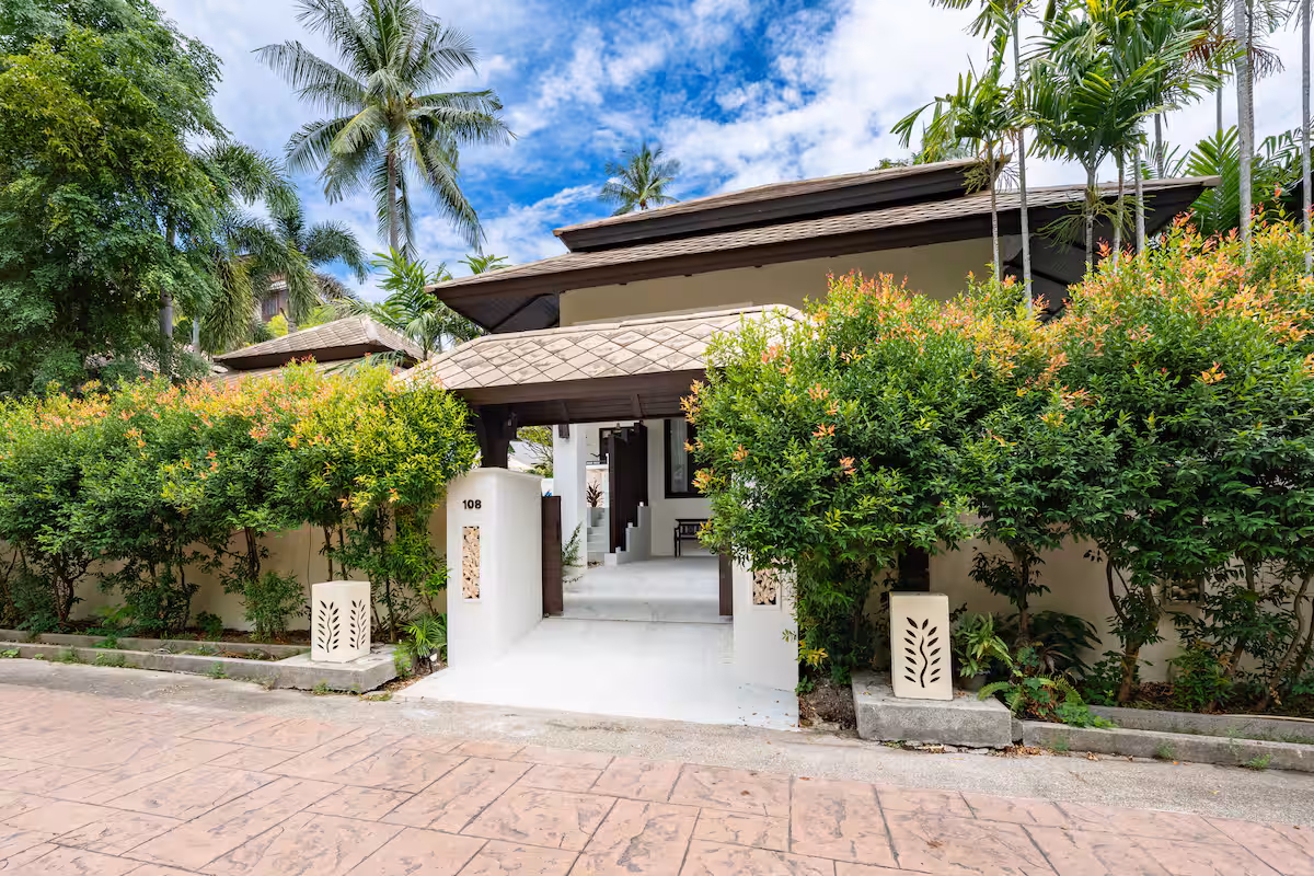 The villa is at Kirikayan resort in Maenam, 24hr with security With 3 bedrooms ensuite with AC in both bedrooms, with private pool. Western Kitchen (with 2AC), Wifi, microwave, dishwasher, laundry, etc.