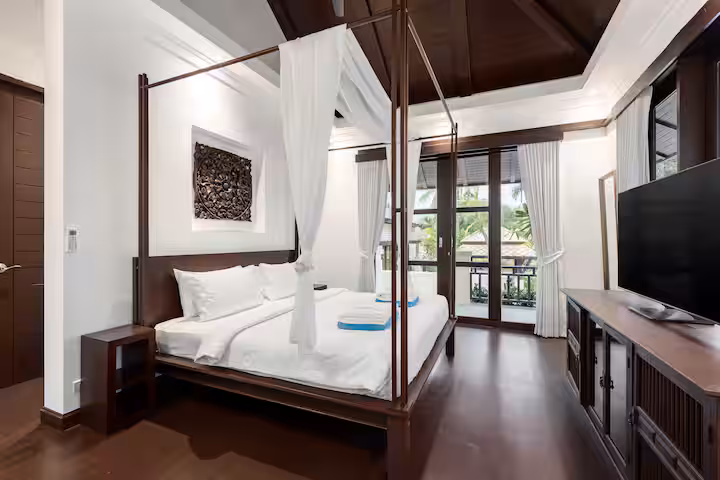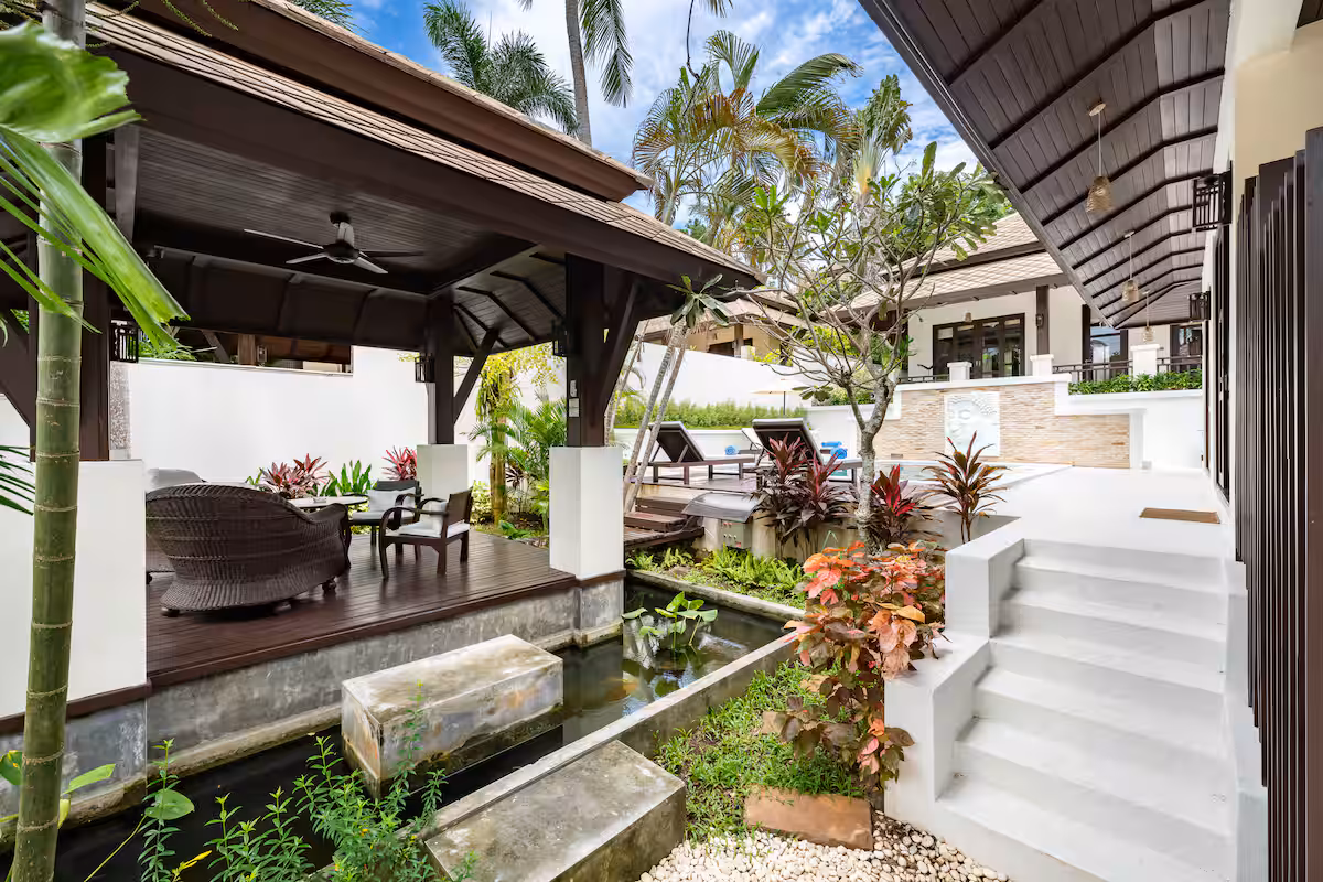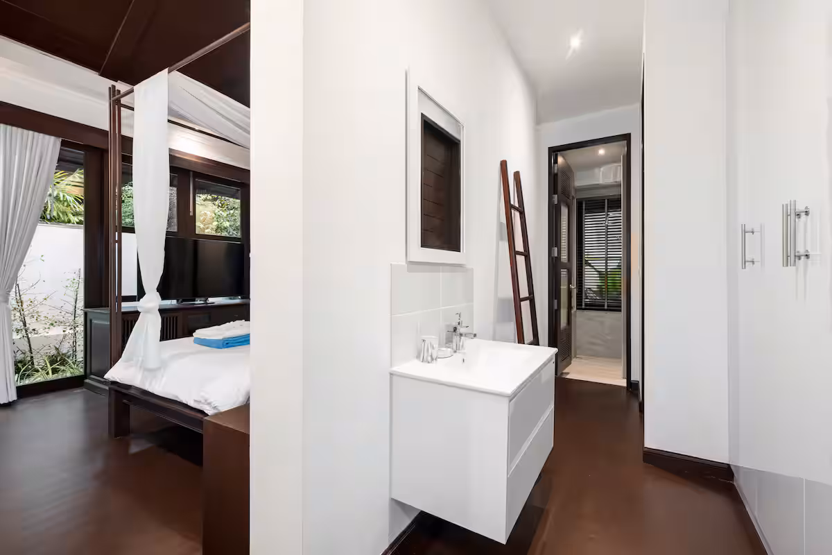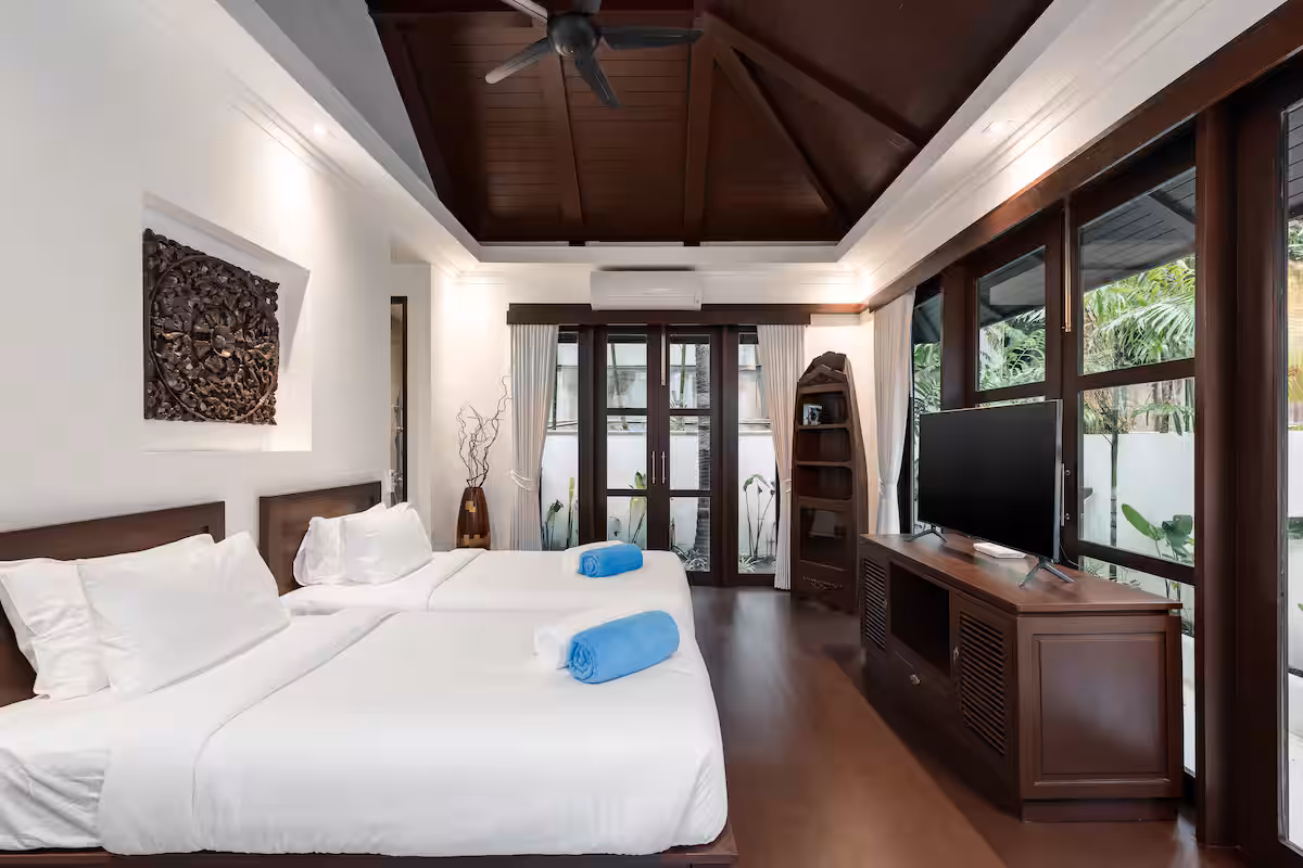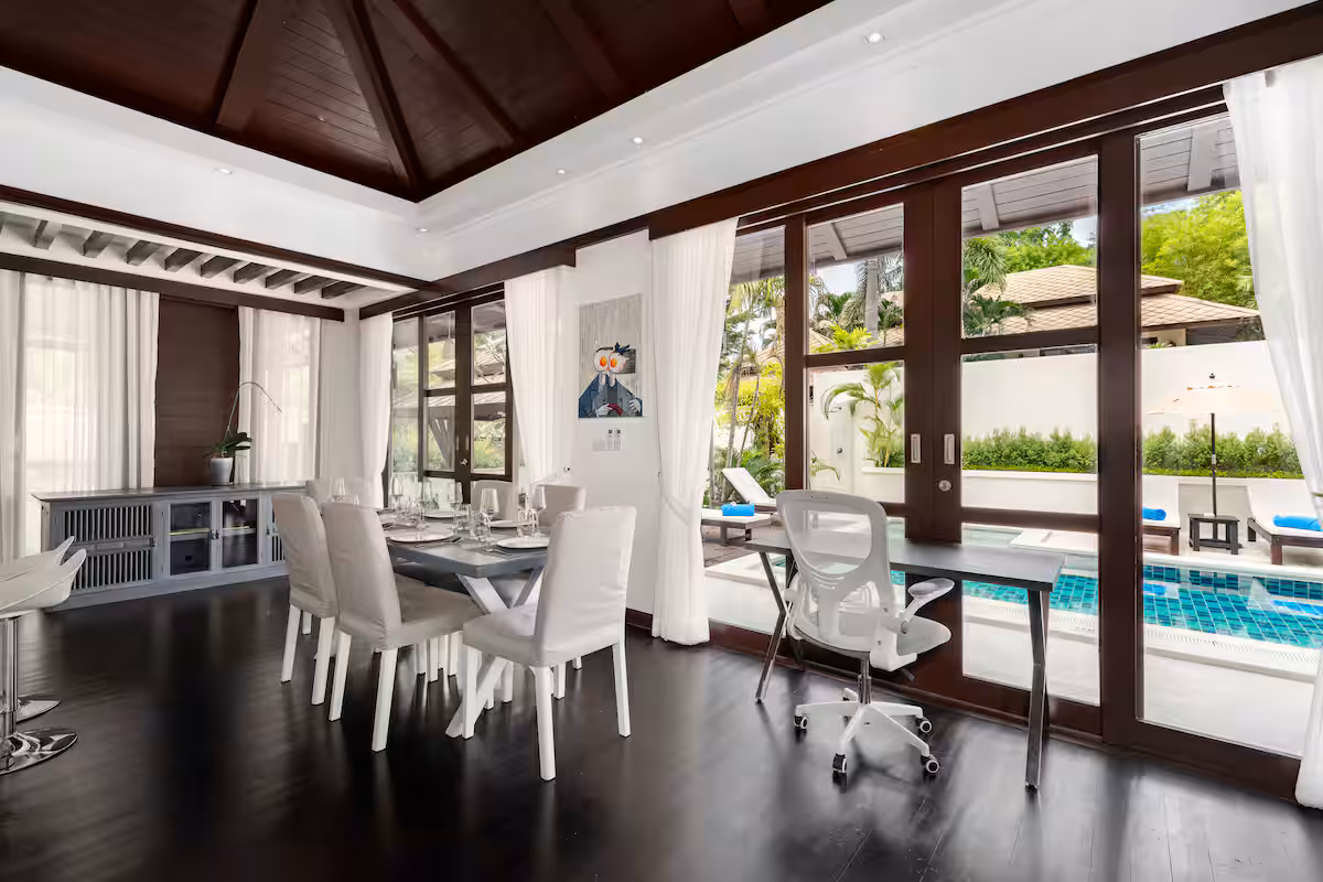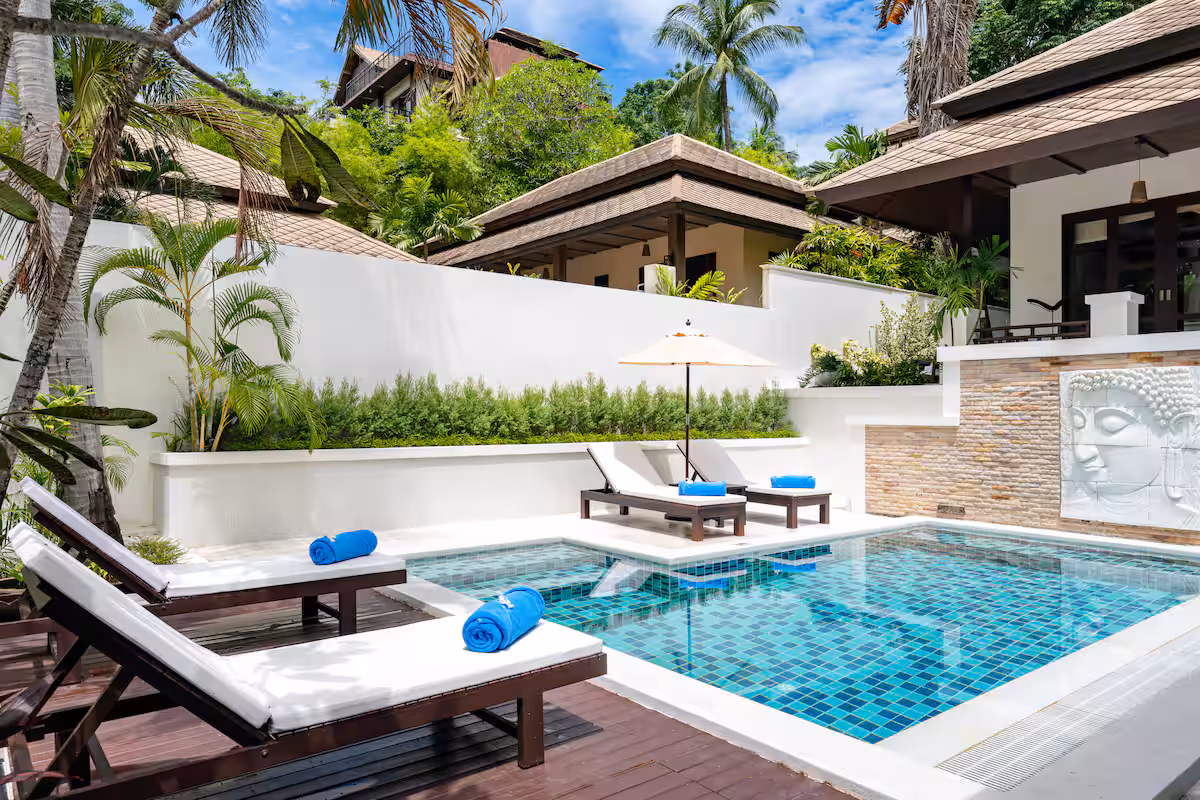 The villa is at Kirikayan resort in Maenam, 24hr with security With 3 bedrooms ensuite with AC in both bedrooms, with private pool. Western Kitchen (with 2AC), Wifi, microwave, dishwasher, laundry, etc.