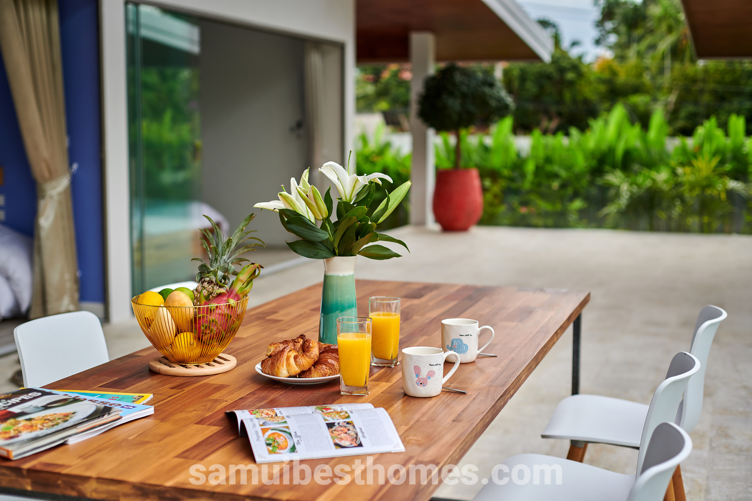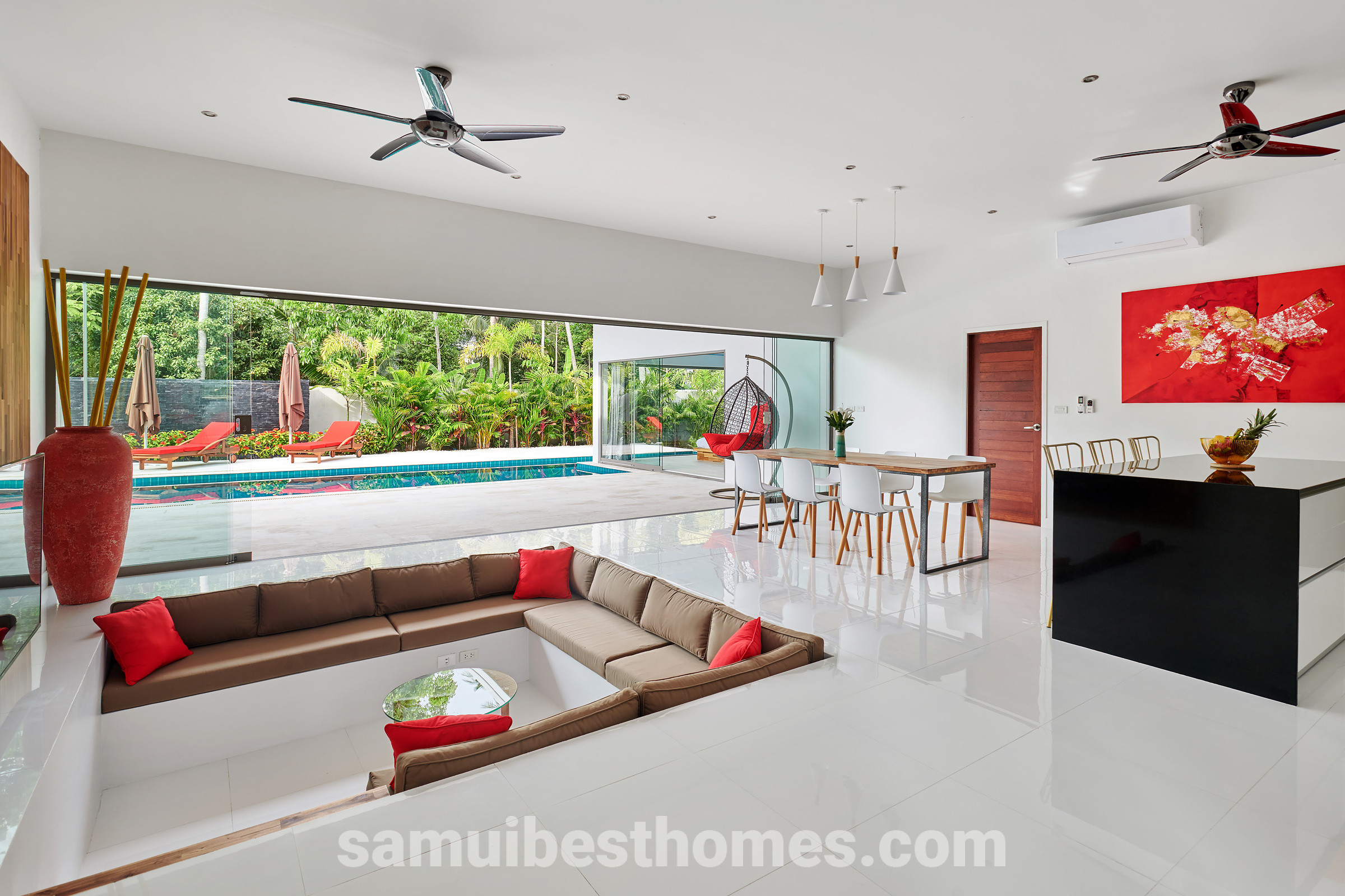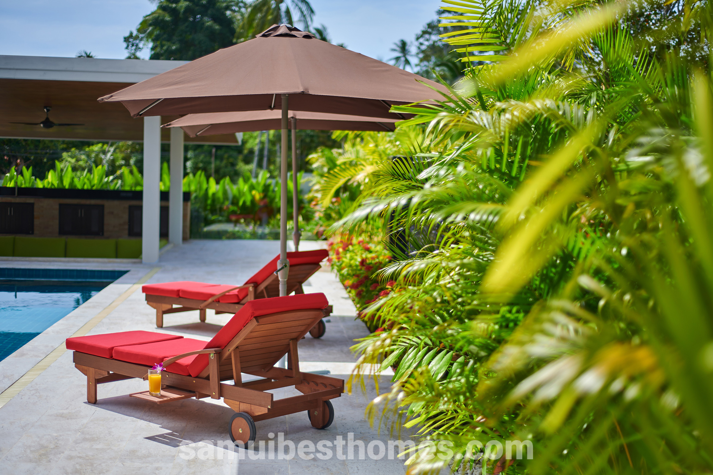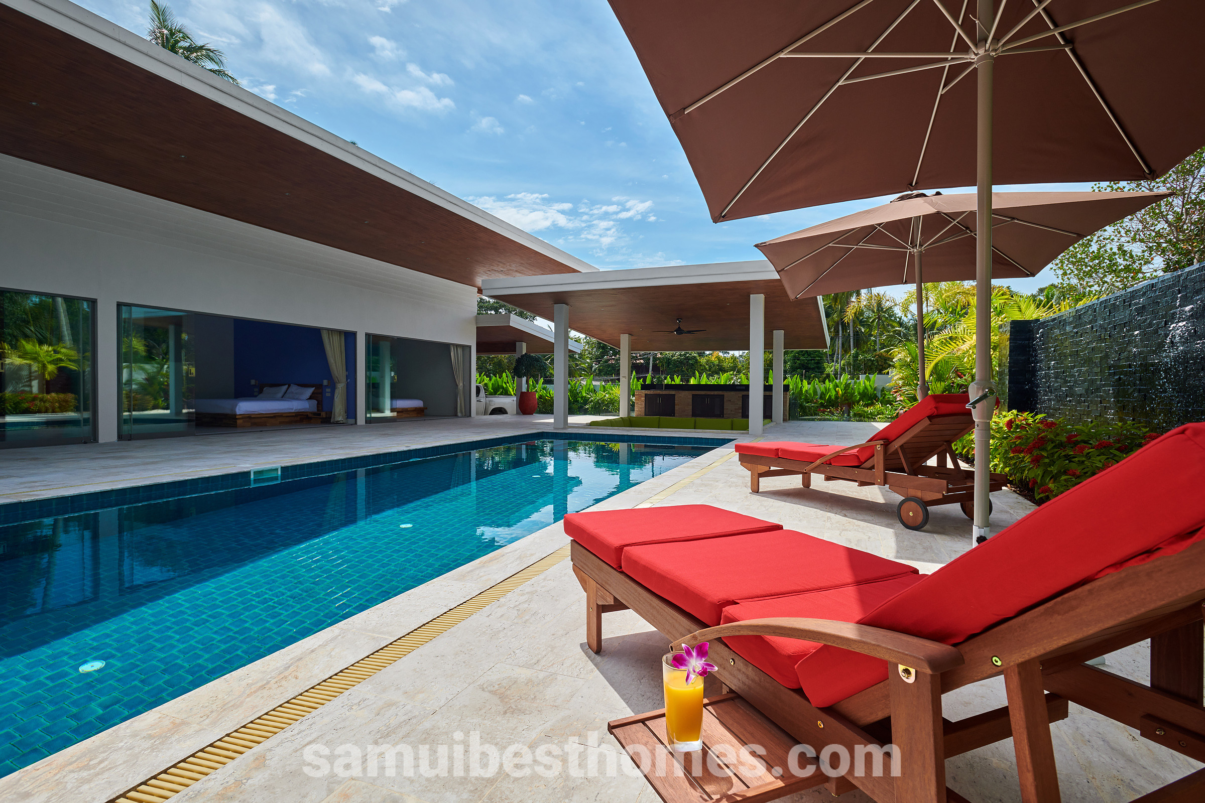 At the heart of the villa lies a spectacular 17-metre swimming pool with a jacuzzi, surrounded by generous terraces perfect for relaxing or entertaining. The open-plan living areas flow seamlessly into the outdoor lounges, creating a relaxed tropical lifestyle. With high-speed fibre optic WiFi, a 55-inch smart TV, and a fully equipped modern kitchen, every comfort is taken care of.
